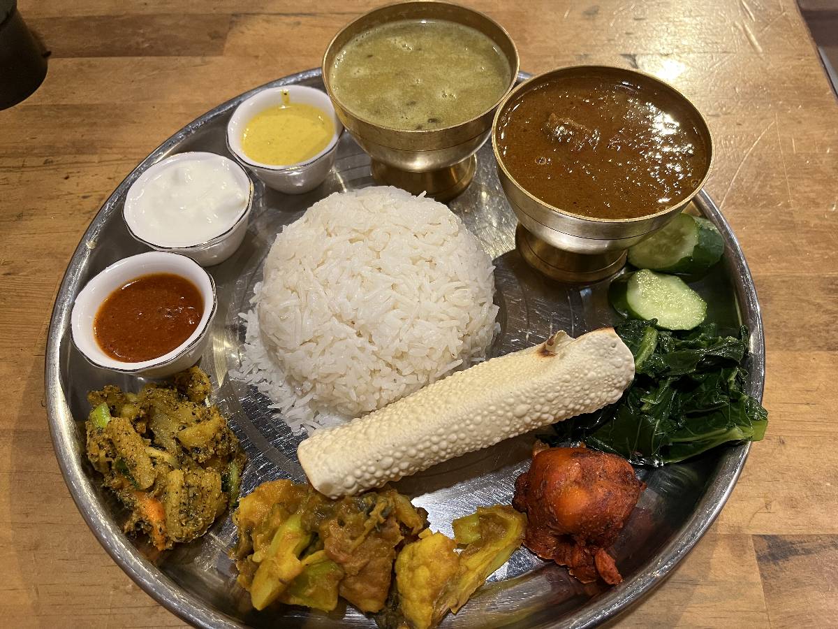 いわゆるダルバート的なものが3つ、ネパールのお餅?ディドのセットもある。他にはカレーとナン、私が選んだのはダルバートの中でもちょっと品数が多い「シラウトカナセット」をマトンカレーで。